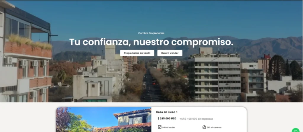 Versión adaptada a dispositivos móviles con botón de WhatsApp, formulario de contacto y mapa interactivo para facilitar la comunicación con clientes.